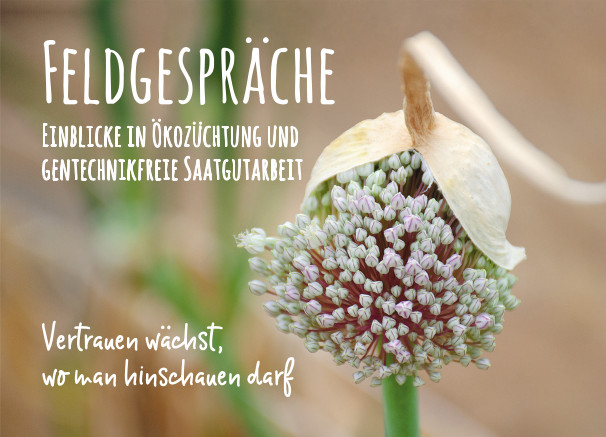 Am Messe-Mittwoch findet ein exemplarisches „Feldgespräch“ mit Johanna Fellner und Sebastian Vornhecke am Gemeinschaftsstand statt (s.o.). 2025 haben bereits zahlreiche Feldgespräche auf Höfen und in Gartenbau-Betrieben stattgefunden. Das Angebot wird organisiert von Züchter:innen, Kultursaat e.V. bioverita, dem Dachverband Ökologische Pflanzenzüchtung in Deutschland e.V., und der Zukunftsstiftung Landwirtschaft und soll 2026 fortgeführt und ausgebaut werden.